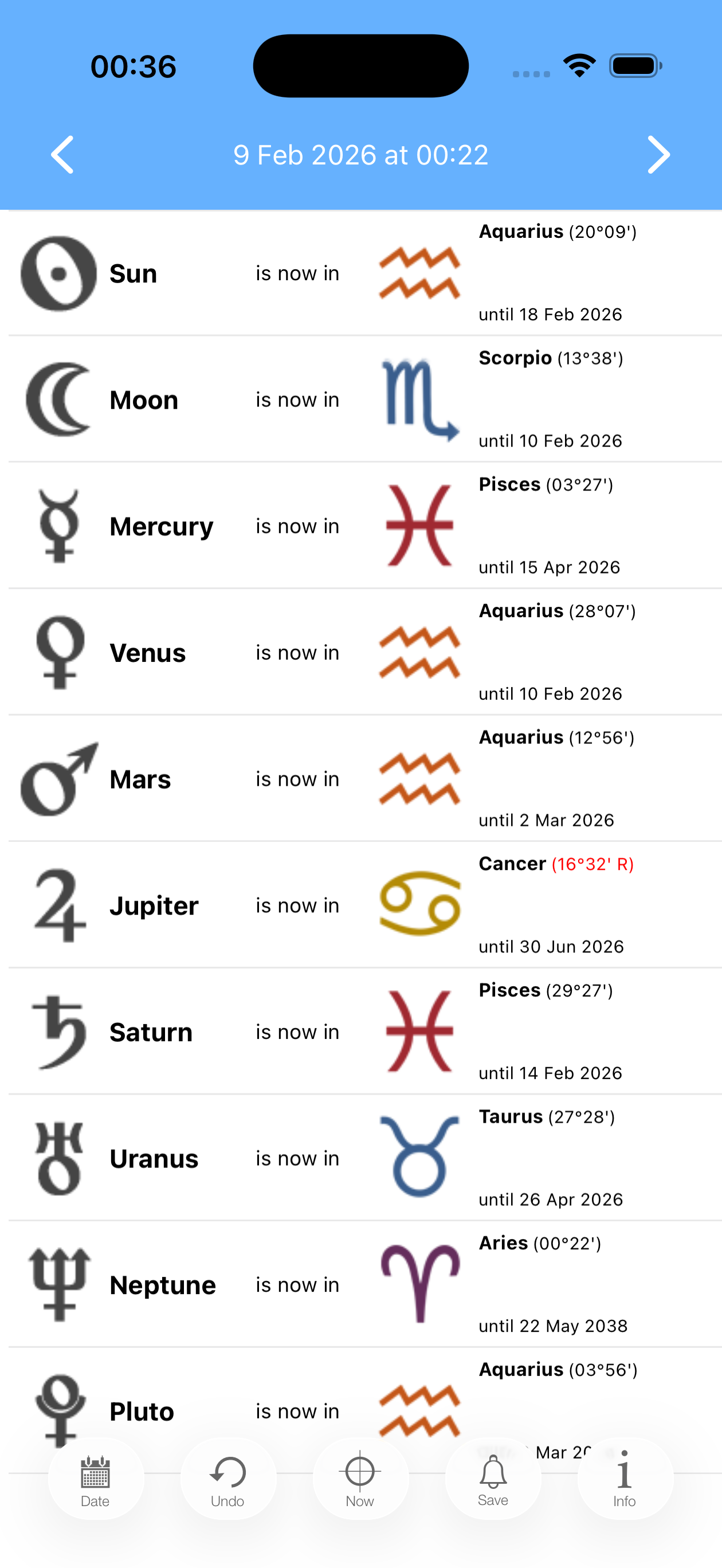 Ingresses Pro helps you track the movement of the planets through the zodiac. See the current sign, the next ingress, and upcoming retrograde or direct stations, all from a fast, offline database that covers 1920 through 2050.